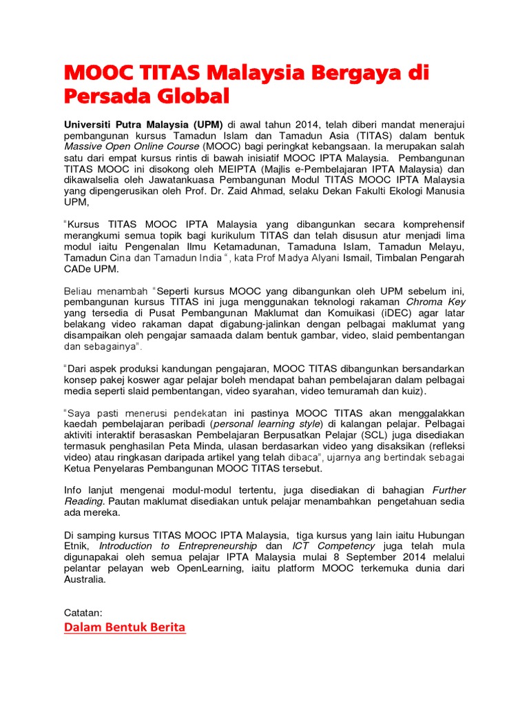 Video ini ialah sebahagian dari. Kursus titas mooc ipta malaysia yang dibangunkan secara komprehensif merangkumi semua topik bagi kurikulum titas dan telah disusun atur menjadi lima modul iaitu pengenalan ilmu ketamadunan, tamaduna islam, tamadun melayu, tamadun cina dan tamadun india. Mooc.org is an extension of edx.org, a leader in online courses. Currently, moocs malaysia has offered 63 interesting courses with 137,946 students from 80 countries that follow moocs malaysia. Massive open online courses (mooc) and its possibilities as instrument of formal, nonformal.